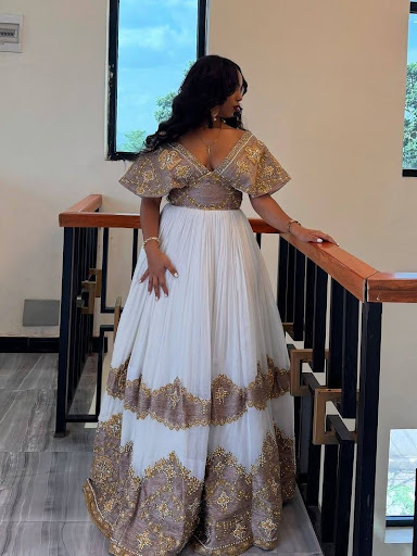 No Ethiopian wedding is complete without its iconic attire. The bride often shines in a habesha kemis, a flowing white cotton gown decorated with vibrant embroidery along the borders. These are sometimes modernized into Ethiopian wedding gowns, combining traditional handwoven fabrics with contemporary tailoring.